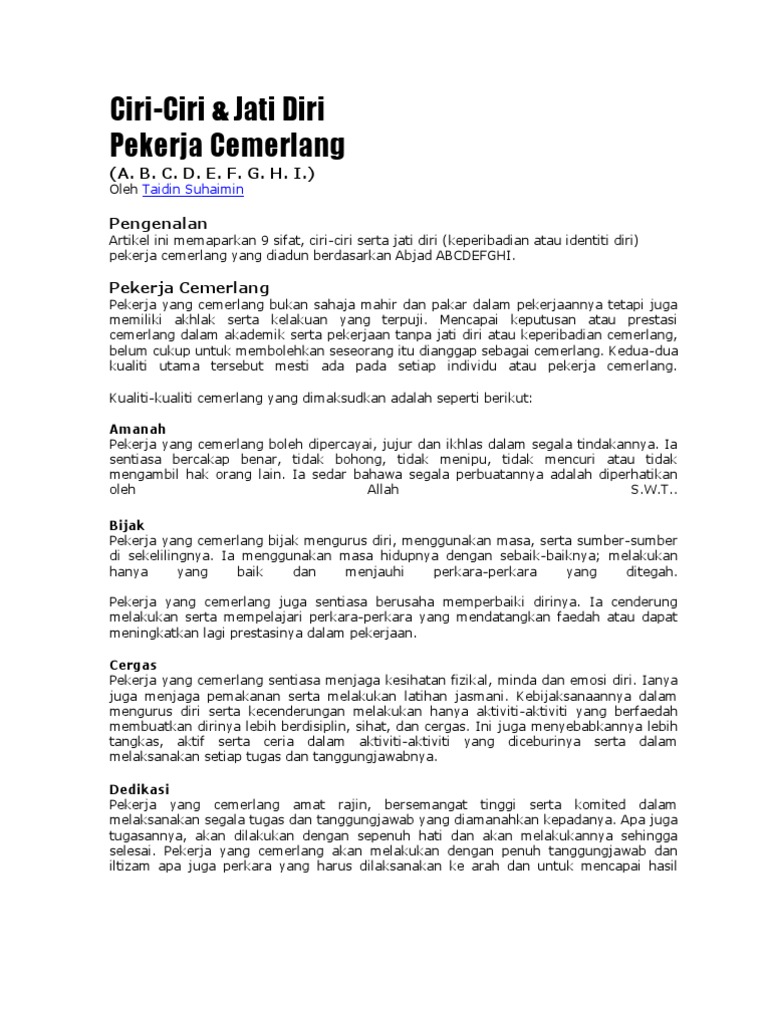 Pdf ciri ciri pekerja cemerlang mengikut persepsi majikan dan. Bagi menghasilkan penulisan karangan yang cemerlang pelajar seharusnya melakukan latihan tambahan serta mendapatkan bimbingan dan panduan daripada guru. Sebagai peran contoh iman pekerja yang cemerlang sentiasa taat kepada perintah allah s.